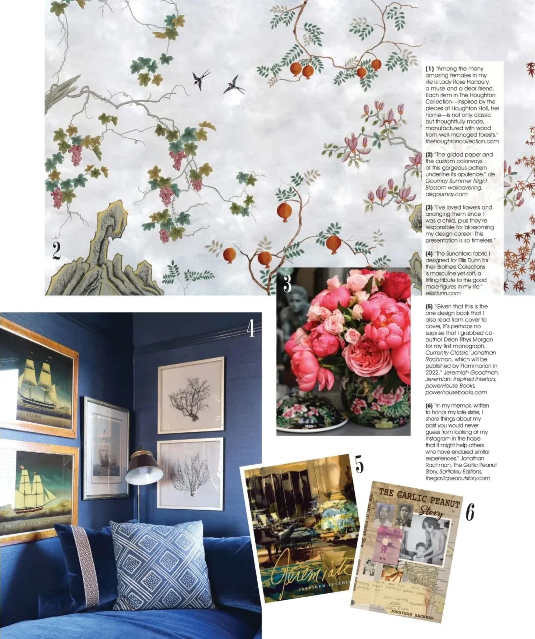 “Jonathan’s work has developed into an extension of his personality - it is warm, inviting, stylish, and luxurious. His rooms are filled with well thought out and original details, beautiful wallpapers, wonderful passementerie, and exquisite colour combinations. Everything is carefully considered, furniture perfectly placed and magical pieces chosen to give his rooms that dash of daring. His imagination is like no other. I hope you enjoy this book as much as I have.”